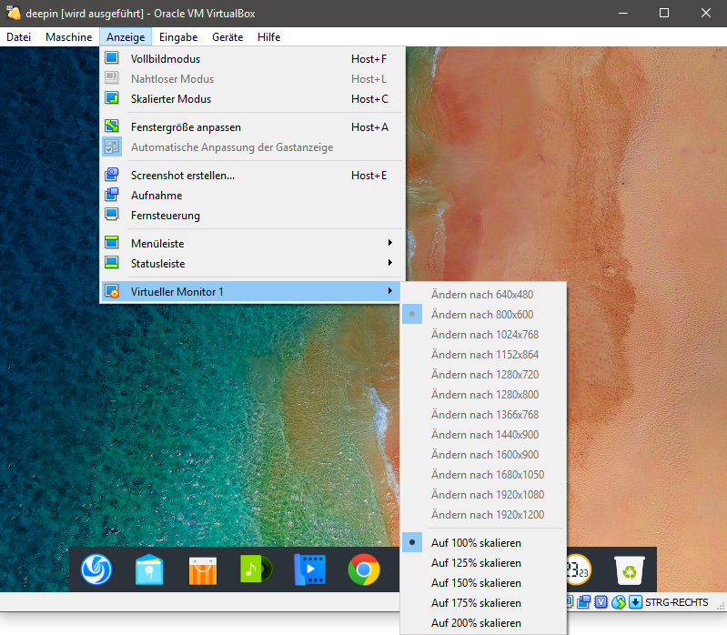 ich habe folgendes Problem: Ich nutze VirtualBox (Version 6.0.6) und möchte deepin 15.10 und Windows 7 einsetzen. Mit keiner der beiden VMs ist es möglich die Auflösung (siehe Anhang) zu ändern.