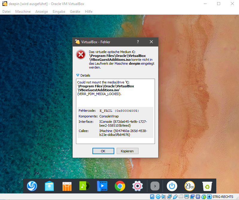 3. versucht VBoxGuestAdditions.iso über "Geräte->Gasterweiterungen einlegen..." einzubinden