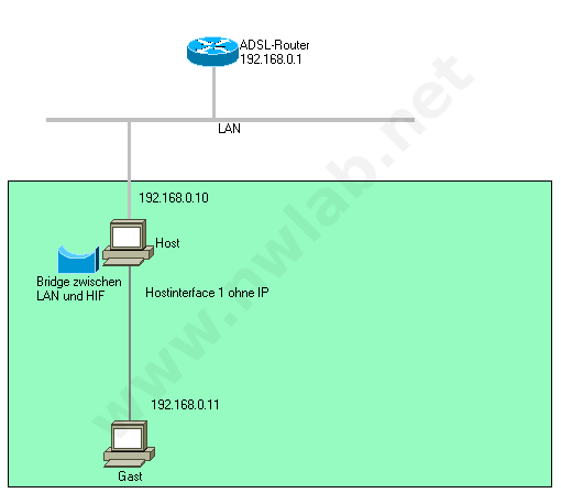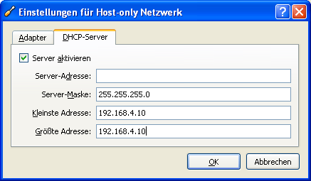Dem Host-only-Adapter habe ich die 192.168.4.9 gegeben und dem im Host-only-Adapter integriertem DHCP-Server die Range 192.168.4.10 bis .10, sodass er eigentlich nur die .10 verteilen kann. dann habe ich den Debian-NIC an den Host-Only-Adapter gebunden und den Host-only Adapter und den physischen NIC auf dem Server mit Windows Boardmitteln gebridged.