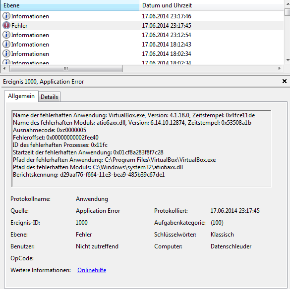 In letzter Zeit zickt meine VM in der VirtualBox (Ubuntu 13) ein wenig herum..... zuletzt hatte ich Probleme, dass die beim Speichern des aktuellen Zustands immer abgestürzt ist; also VirtualBox komplett. Es kam dann die Windows-Meldung, dass das Programm nicht mehr richtig funktioniert. Es war eine ATI-Datei dafür verantwortlich und nach der Installation einer älteren Version des CCC von ATI habe ich das Problem nicht mehr gehabt.