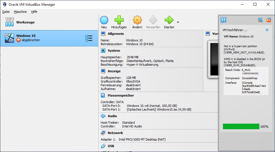 ich möchte gerne ein zusätzliches W10 auf meinem PC per VM installieren. Leider gibt es Probleme. Ich habe soweit die Tutorials abgearbeitet, aber es kommt immer folgende Fehlermeldung: