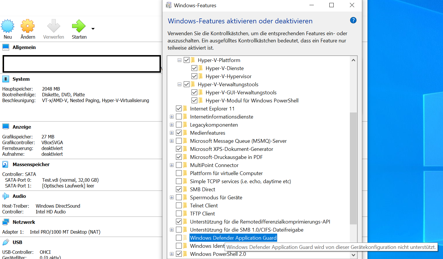 'Windows Defender Application Guard wird von dieser Gerätekonfiguration nicht unterstützt'.