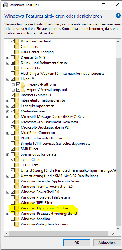 Hyper-V war anfangs nicht aktiv (also nichts aktiviert). Nach dem Beitrag von Strikerking habe ich alles aktiviert und den Rechner neu gestartet.