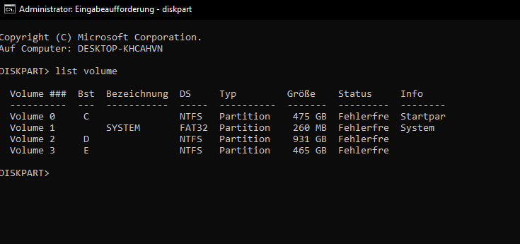 Unter "list volume" werden genau die Datenträger, die ich löschen möchte, leider nicht angezeigt.