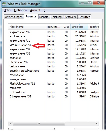 Im Taskmanager wird aber angezeigt, das Virtual PC im 32bit-Modus läuft (Virtual PC.exe *32).