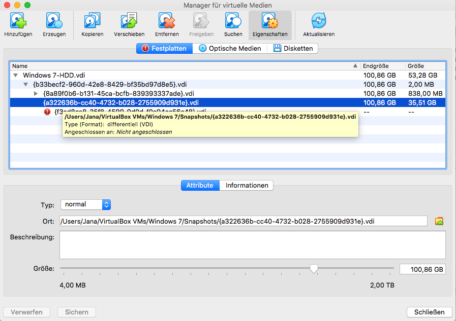 Dann habe virtualBox heute gestartet. Nach ein paar Minuten ist die Sitzung abgestürzt. Dann startete ich sie erneut und sehe plötzlich, dass ich einen alten Stand drauf habe, da sich dieser von der vorherigen Sitzung unterscheidet, die zuvor abgestürzt ist. Dann schaute ich in die Snapshots vom Mac und sehe das Datum von 2018.