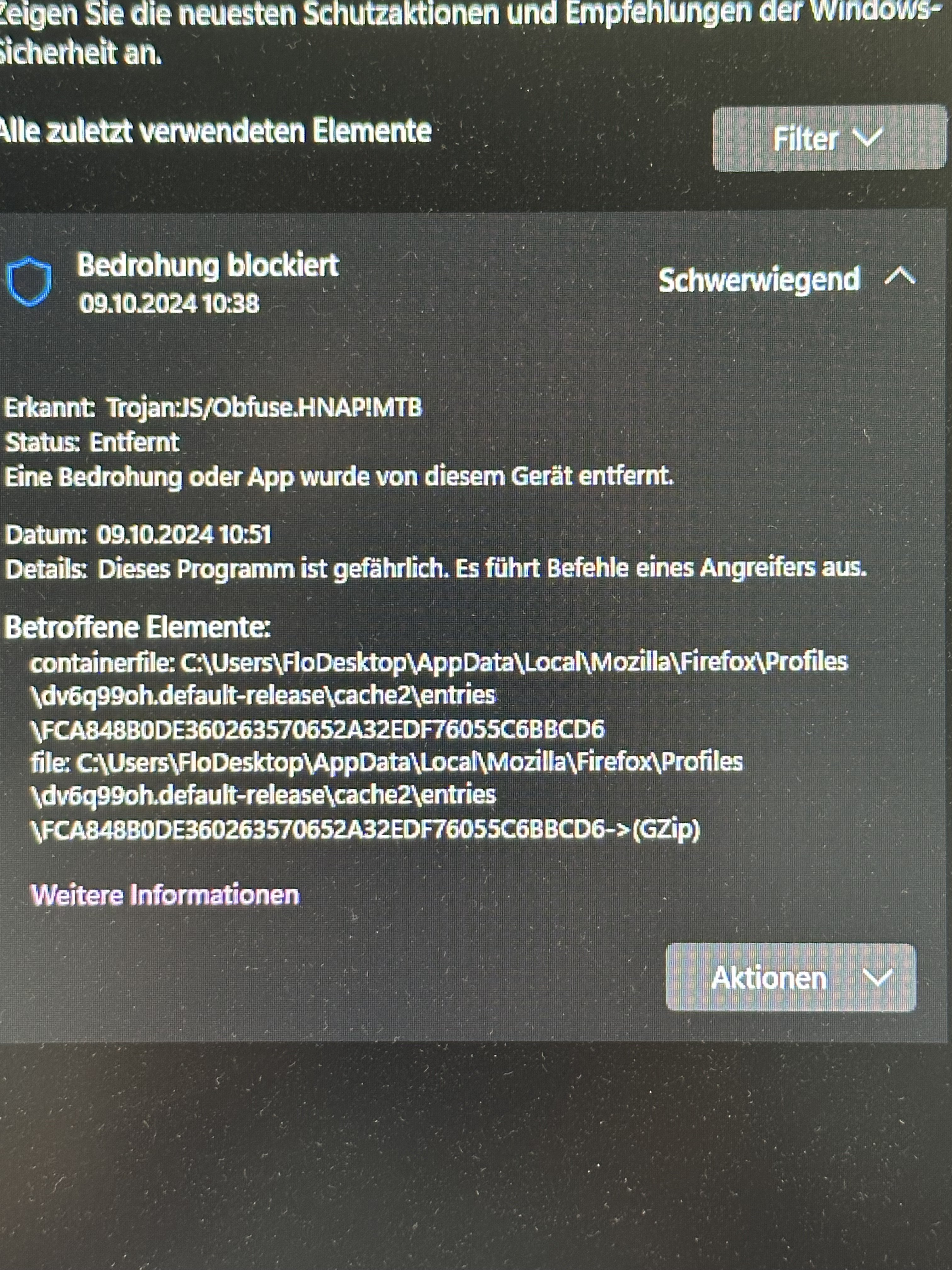 habe gerade mal einen vollständigen Scan mit MS Defender durchlaufen lassen und es wurde ein Trojaner entdeckt mit dem Namen: trojan js obfuse hnat mtb. Habe dann auf „entfernen“ gedrückt und den Scan nochmal durchlaufen lassen. Dabei wurde er nicht mehr gefunden. Kann ich mir jetzt sicher sein, dass er wirklich entfernt wurde? Der Virus wurde im Profile von Firefox entdeckt. Ich bin dem Pfad gefolgt, wo er laut Defender lokalisiert wurde. Und die Datei ist wirklich nicht mehr da, aber irgendwie traue ich dem nicht so ganz.