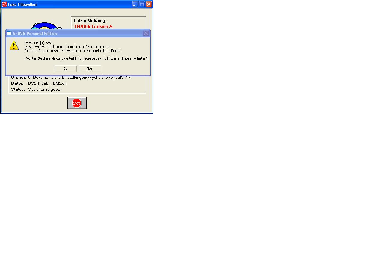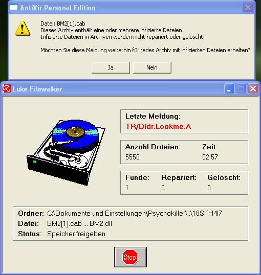 Wenns auch nicht der beste Scanner ist, würd ich dir mal Norton AV 2004 vorschlagen. Lass damit mal einen Komplett-Scann durchlaufen. Da hast du dann auch die Auswahlmöglichkeiten. Dein System ist offensichtlich infiziert, aber das was du da hast, ist eine Sicherheitswarnung. Du musst schon das Scanner-Programm selber starten.