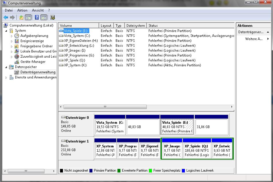 Nach Stunden des Ärgers sollte das dicke Ei noch kommen. Nach dem einrichten von XP bottete ich dann Vista das erstmal wieder. Was muss ich feststellen? die 2te und 4te Partition werden nicht mehr im Explorer angezeigt Oo...mir ist schon das Herz in die Hose gerutscht weil auf einer der 2 alle eigenen Dateien liegen (ja ich bin ein Backup Muffel *g). Schnell mal XP gebootet und geschaut wie es da aussieht. Merkwürdiger Weise werden die Partionen dort ALLE korrekt angezeigt und ich kann ohne Problemen darauf zugreifen Oo. Wieder zurück in Vista dachte ich das es evtl ein Laufwerksbuchstabenkonflikt sei...ab in die Datenträgerverwaltung. Dort werden die 2 fehlenden Partionen zwar unten gelistet, aber ohne Buchstaben usw. ABER: ein Rechtsklick und "Eigenschaften" oder "Laufwerksbuchstaben ändern" endet in einer Fehlermeldung des Snap-Ins ^^.