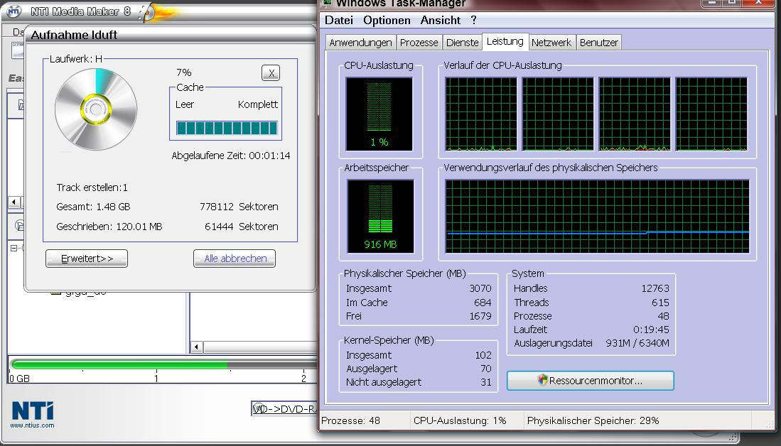 tcha dieses hoch gelobte Brenn Tool CDBurnerXP unterstützt keine Multicore CPUs , nur ein Kern wird sehr hoch ausgelastet , PC wird deswegen lauter und verraucht unnötig viel Strom dabei, wie gesagt ich habe nur mit diesem Tool das Problem, mit ImgBrun wird die CPU besser und gleichmäßig angesteuert Core 4 und I7 .. nur leider kann ImgBrun keine DVDs/CDs so einfach kopieren , was ich hin und wieder mal brauche .tcha und nu..?