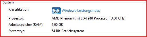 Folgendes: Ich besitze Windows Vista 64 bit dies läuft auf einem Gigabyte MA770-UD3, 4 GB Ram von A-Data einr ATI 4780 1 GB Graka und einen Phenom II X940 BE.