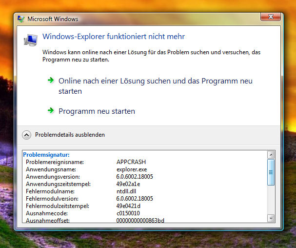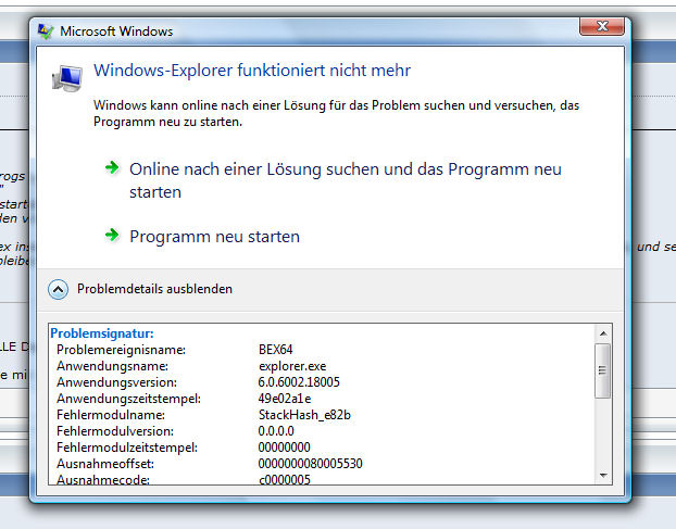 Da läge es nahe, das es mit irgendwelchen Einträgen im Kontextmenü zusammenhängt: den Trick mit dem securom eintrag über shellexview deaktivieren habe ich schon versucht. ich glaube auch nicht, dass es nur an iwelchen einträgen liegt, da er mir vorhin einfach nur beim ausschneiden per strg + x abgestürzt ist. ganz krass ists wenn ich auf den start button in der taskleiste rechtsklick mache..