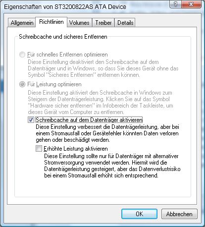 2. ergänzend mal über den Geräte-Manager > Laufwerke > Deine Festplatten (Doppelklick) > Richtlinien: "Für Leistung optimieren"; "Schreibcache auf dem Datenträger aktivieren"; "Erhöhte Leistung optimieren" jeweils aktivieren - siehe Screenshot