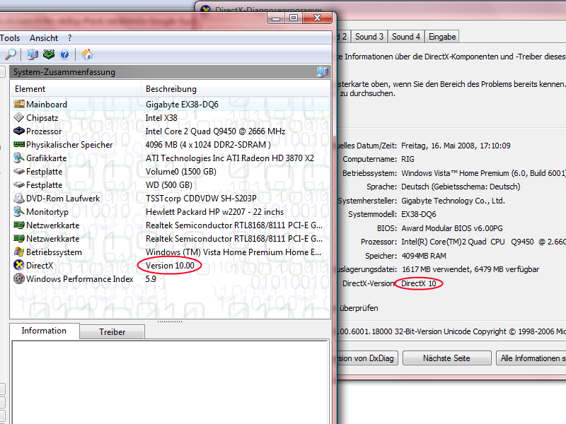 Ich habe Vista Home Premium x64 mit SP1 installiert. Gestern habe ich Assassin's Creed gekauft. Das Spiel läuft toll, allerdings scheinen die Schatten nicht immer wirklich geglättet zu sein. Deswegen habe ich mal nachgeforscht, ob DX10.1 auch wirklich installiert ist, was aber anscheinend nicht der Fall zu sein scheint.. Ich habe mir auch das DX-Websetup heruntergeladen, dieses meldet aber, dass die aktuellste DX-Version installiert sei.