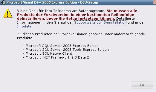ich hab hier den visual c++ und wenn ich den installieren will kommt immer sonne fehlermeldungen, dass ich alte versionen von microsoft sql 2005 deinstallieren soll ... aber die hab ich gar net drauf ..