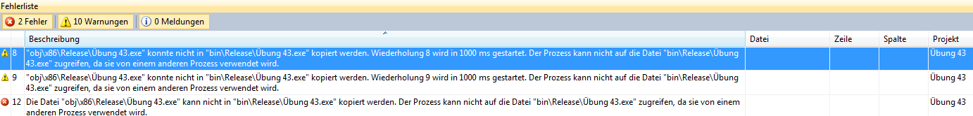 Stell mal sicher dass deine Übung nicht noch läuft. Vorallem wenn du mit STRG+F5, also ohne attachtem debugger startest, kann die Anwendung einfach weiterlaufen und dann lässt sich natürlich keine neue Version kompilieren ;)