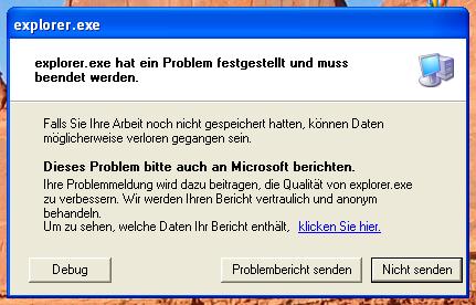 Dann stürzt der Explorer ab, die Desktopsymbole und die Startleiste verschwinden, und tauchen nach wenigen Sekunden wieder auf.