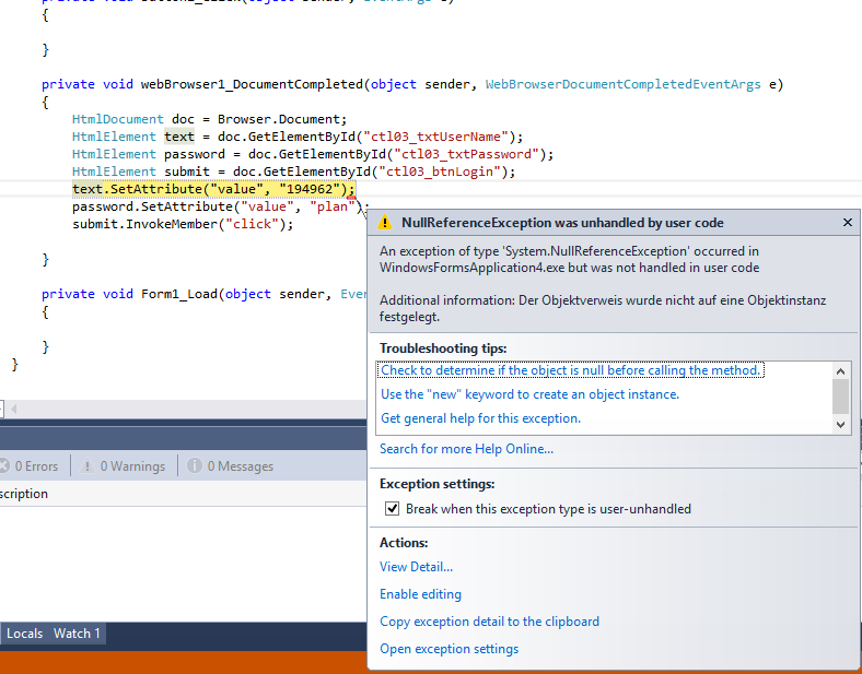 Ich bekomme folgende Meldung beim unten stehenden Code: "System.NullReferenceException"
