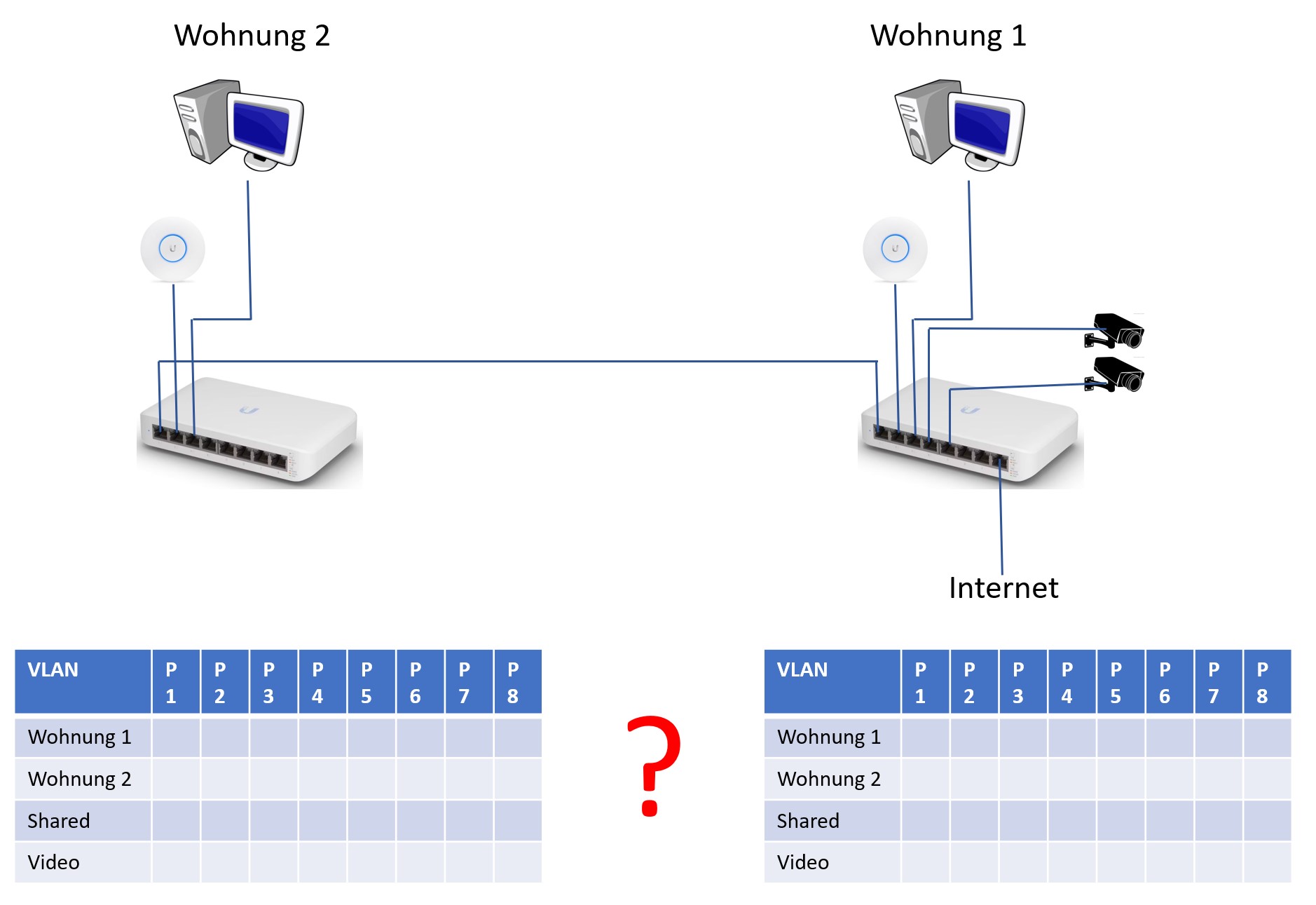 - In Wohnung 2 reicht wohl ein kleiner PoE-Switch mit 8 Ports, davon der Uplink 10GB.
