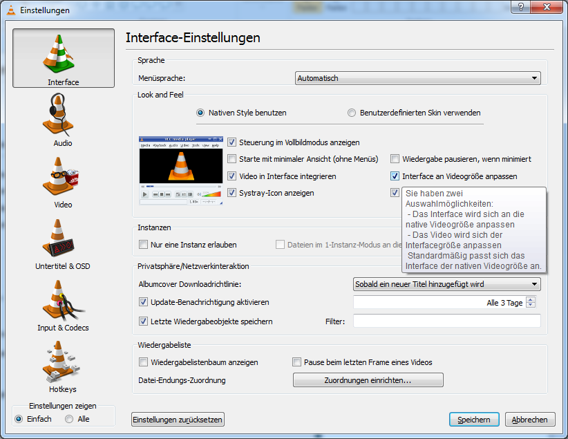 In den Optionen gibts aber auch eine Option, dass das Fenster nicht auf Videogröße gesetzt wird.