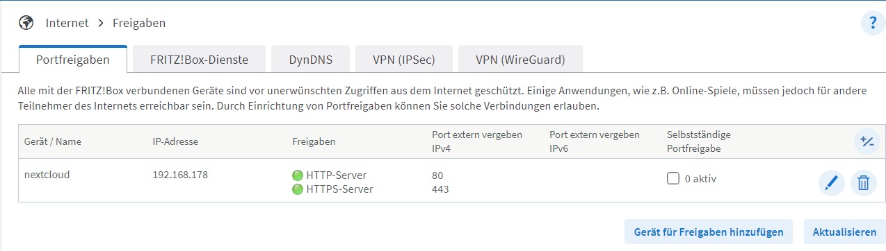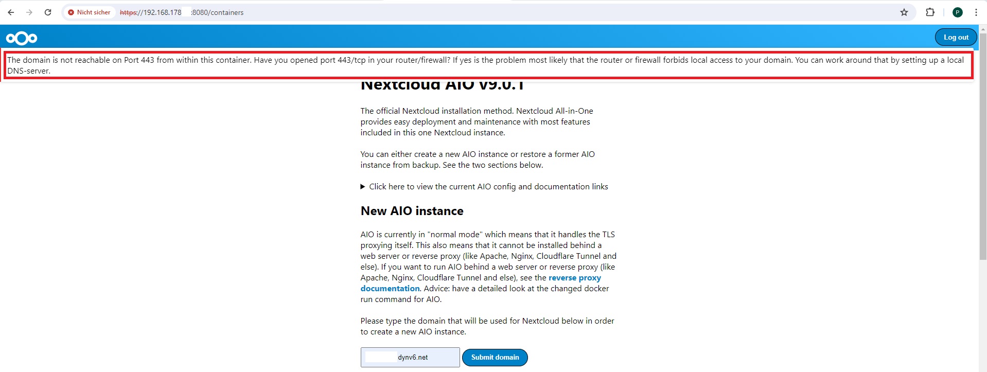Habe mit DDClient eine Dyndns verknüpft. Nur irgendwie komme ich über diese nicht auf die Nextcloud. Bzw gibt er mir den Fehler beim Web Install "The domain is not reachable on Port 443 from within this container. Have you opened port 443/tcp in your router/firewall? If yes is the problem most likely that the router or firewall forbids local access to your domain. You can work around that by setting up a local DNS-server."