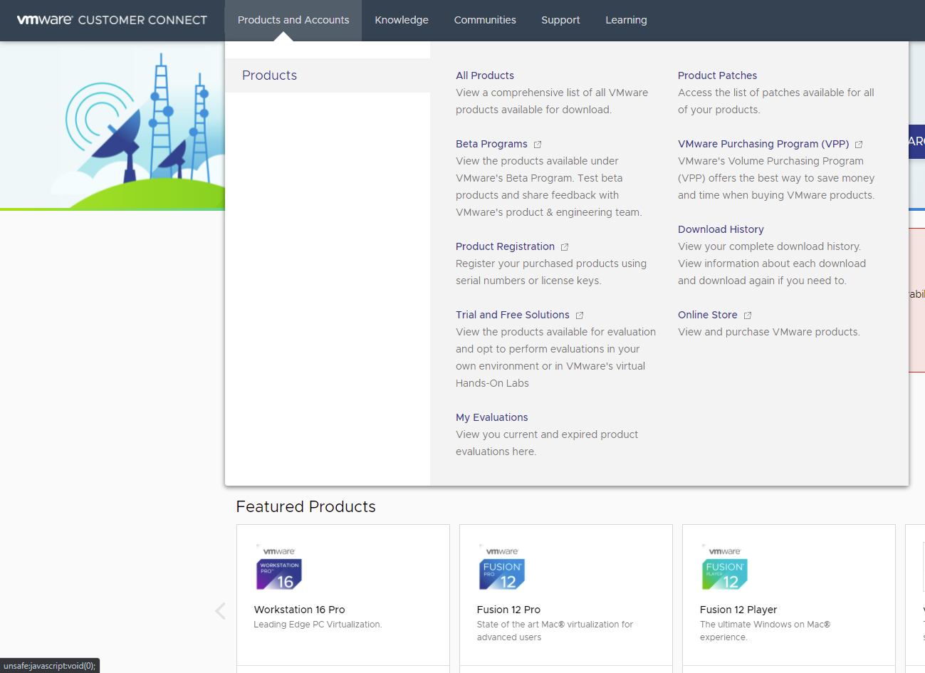 Die FAQ von VMware ist keine große Hilfe, da der Bereich Products and Accounts > Accounts > Manage Licenses bei mir nicht aufzufinden ist (siehe Bild).
