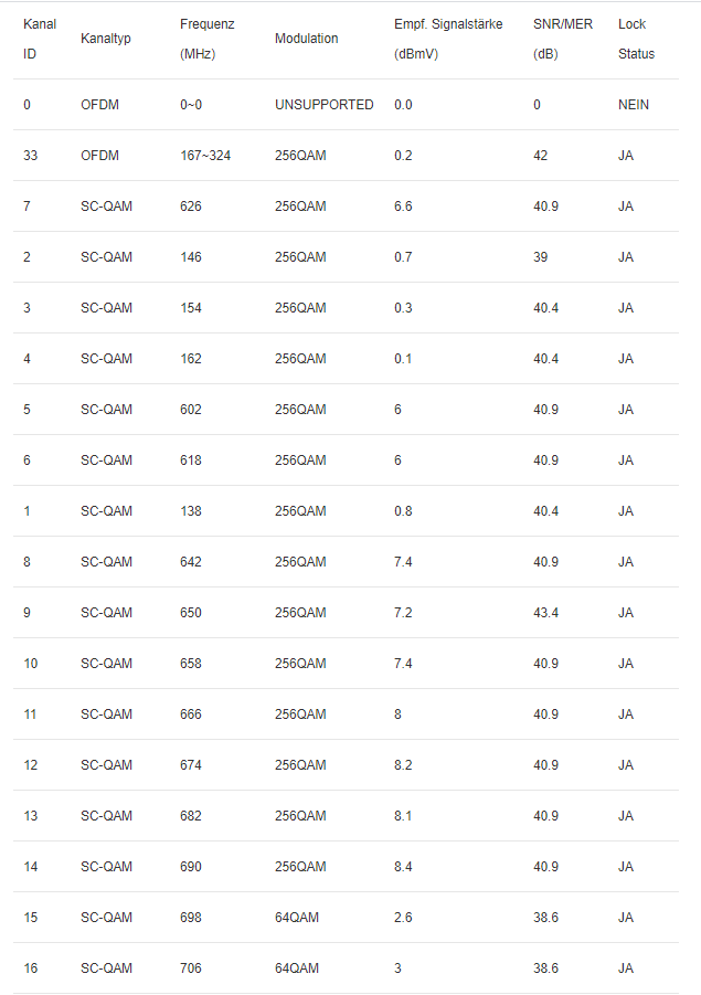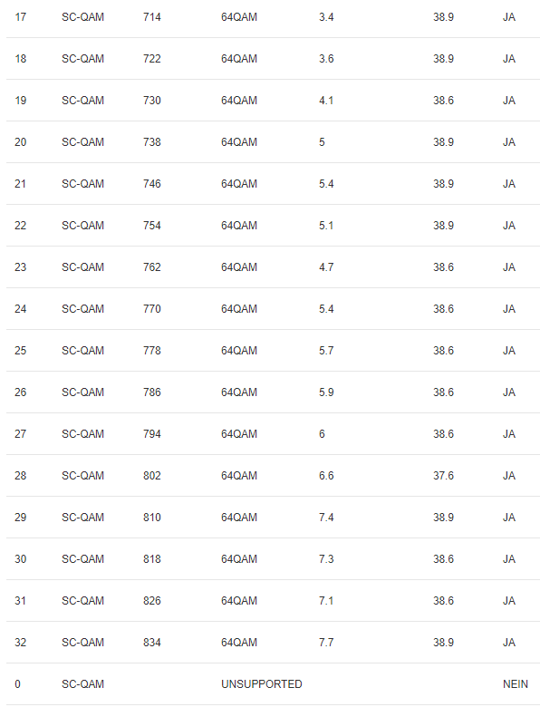 was sich nach meiner Störungsmeldung zwar wieder gebessert hat (derzeit 4x 64QAM), manchmal läuft ein Kanal aber auch nur mit 8QAM.
