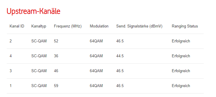 Nun ist mir beim DOCSIS Status des Modems bei den Uploadkanälen aufgefallen, dass 3 der 4 Kanäle auf QPSK liefen, einer auf 8QAM,