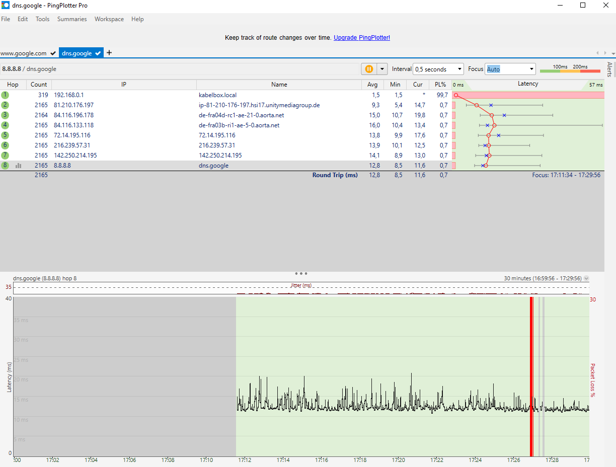 Ich hab meinen Rechner gerade komplett neu aufgesetzt. Alle Treiber neu drauf, direkt TCPOptimizer drüber laufen lassen. VFST neugestartet. Pingplotter läuft 1 Stunde und bisher kein Ausfall.
