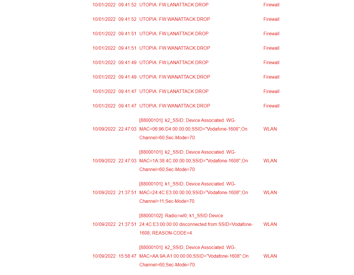 | 10/09/2022 | 15:58:47 | [88000101]: k2_SSID; Device Associated. WG-MAC=AA:9A:A1:00:00:00;SSID="Vodafone-1608";On Channel=60;Sec-Mode=70. | WLAN |