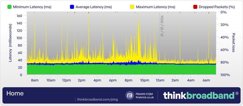 Im Anhang mal ein chaotisches (?) Routing nach thinkbroadband.com, wo ich normal einen Ping von ~30 habe tagsüber. Das sieht dann in beide Richtungen so aus wie das untere Bild.