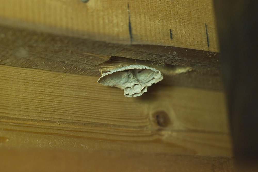 Eine fette Hornisse hat anscheinend gerade Besitzanspruch auf unser Gartenhaus gestellt, und baut sich innen gerade ein Nest.