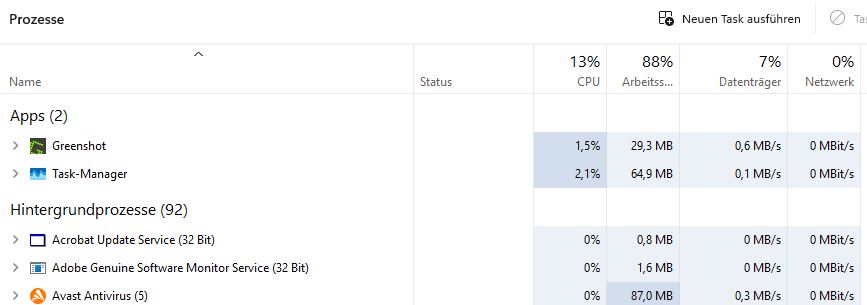 Im Task-Manager geschaut sind 88% belegt, bei zwei aktiven Apps