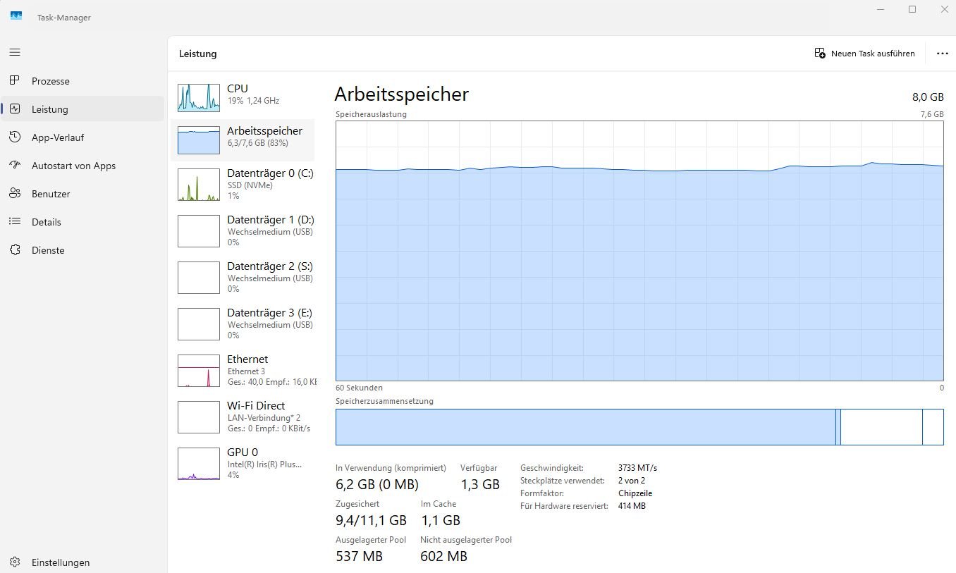 Mein Surface Pro 7 hat 8 GB RAM (nicht erweiterbar). In Chrome crashen öfter Seiten mit einer "zu wenig Speicher" Meldung (zwar mit neu laden zu beheben aber Tendenz steigend) und Anwendungen starten und regieren immer träger.