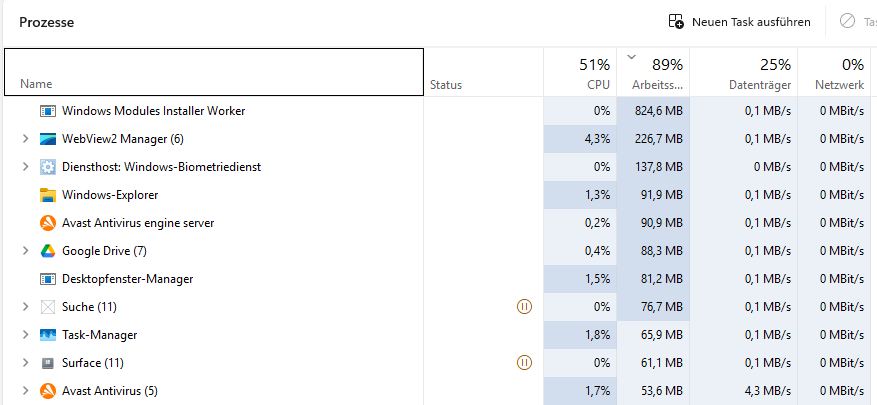 Nach Arbeitsspeicher sortiert wieder die verwundernde Erkenntnis, dass die dort angezeigten Anwendungen niemals die 89% ergeben: