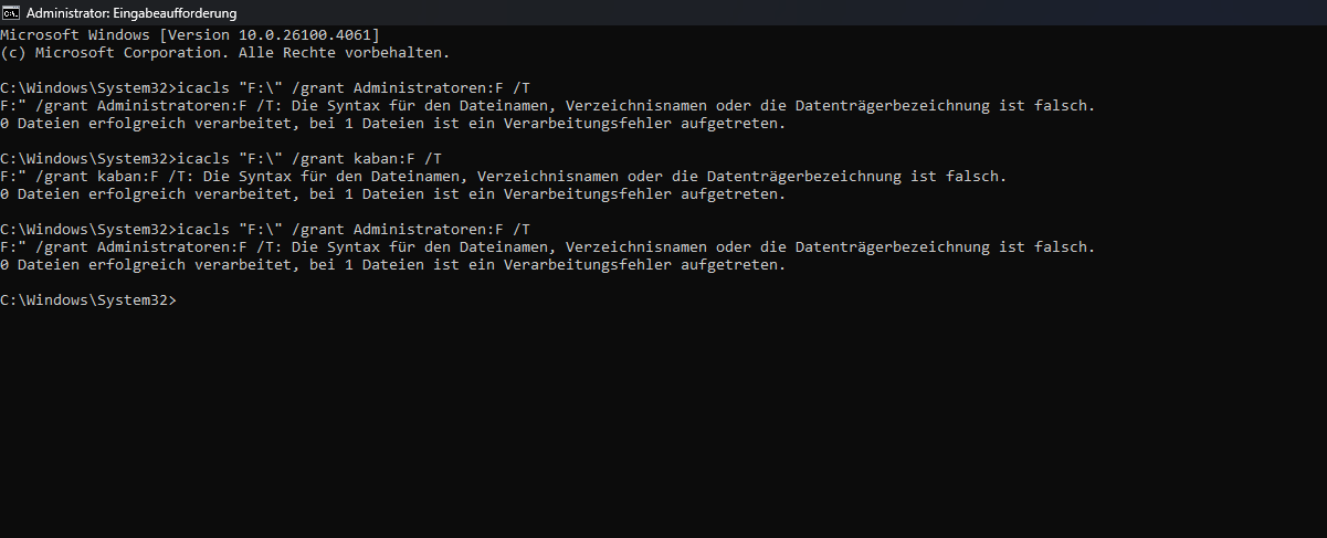 Ich habe verzweifelt versucht mich ins Thema einzulesen und habe den /takeown Befehl in CMD verwendet. Kein Erfolg. Die Zugangsberechtigung ist nicht zurückgekehrt.