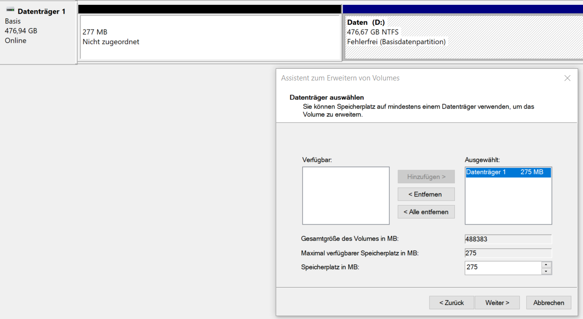 heute eine NVMe in ein externes Gehäuse gepackt. NVMe hatte zuvor ein OS W10 installiert. Habe mit Diskpart alle Partitionen gelöscht und den gewonnenen Platz verwendet um das Volume zu erweitern. Hat bei zwei nicht zugeordneten Bereichen funktioniert (Wiederherstellungspartition und eine weitere zusammengefasst zu einer) - der übrig gebliebene nicht zugeordnete Speicher der EFI Partition von 277MB lässt sich nicht dem Volume hinzufügen außer man macht einen dynamischen Datenträger daraus im Wizard.