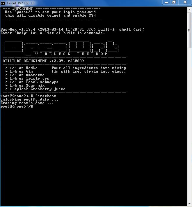 Dann bist du im telnet. Dann tippst du einfach erst einmal ein firstboot. Der Router startet dann neu und ist unter der IP Adresse 192.168.0.1 erreichbar.