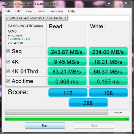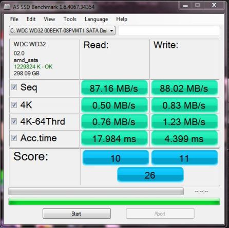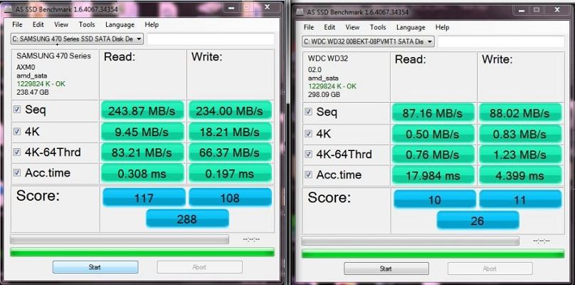 Bessere Sequenzielle Performance bedeutet für Praxis zum Beispiel bessere Leistung beim Kopieren von großen Dateien. 4K und Acc.Time sagen aus, wie schnell die SSD mit kleinen quer über den Datenträger verteilten Zugriffen zurechtkommt (Random-Zugriffe) und wie reaktionsfreudig der Datenträger ist. Im Gegensatz zu sequenziellen Operationen sind Task, die auf gute Random-Performance angewiesen sind wie Programmstarts öfter von der CPU abhängig bzw. durch deren Geschwindigkeit begrenzt. Wir werden also schauen müssen, was von der 9 MB/s schnelleren 4K-Performance (ca. 1900% schneller als die HDD) am Ende übrig bleibt.