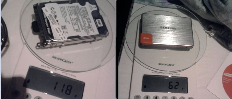 Die Festplatte wiegt 103 Gramm, da nur ein 320GB Platter verbaut ist. Mit der Halterung für einen festen Sitz im Notebook sind es 118 Gramm. Ein weiterer Platter würde 10 Gramm extra "mitbringen". Die SSD hingegen ist 62 Gramm leicht, also 56 Gramm leichter als die HDD. Als Nebenbei-Vergleich: meine Intel X-25M 80GB wiegt 79 Gramm.