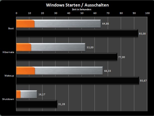 Wie ihr sehen könnt spart man durch die Samsung 470 eine spürbare Menge an Zeit. Das Booten geht ungefähr 30 Sekunden schneller, der Ruhezustand ist 24 Sekunden schneller erreicht, das Aufwecken benötigt auch knapp circa 30 Sekunden weniger Zeit und das Herunterfahren dauert nur noch halb so lange. Eine genaue Beschreibung welche Programme jeweils gestartet wurden z.B. beim Boot und gerade aktiv waren gibt es im Anhang am Ende des Tests.