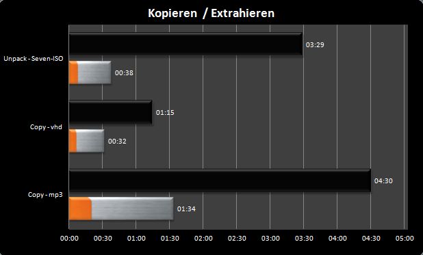 Enorme Zeitersparnis durch die SSD, wobei der Abstand zwischen HDD und SSD beim Kopieren einer großen Datei (Copy vhd) nach am geringsten Ausfällt. Sind auch kleinere Dateien im Spiel (Unpack), rast die SSD auf und davon. Das kopieren von MP3s geht gleich dreimal so schnell.