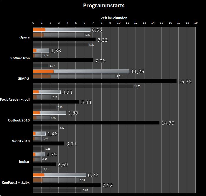 Betrachtungshinweis: In diesem Diagramm habe ich pro Laufwerk jeweils zwei Balken pro Programm. Nach dem ersten Starten eines Programms wurde selbiges geschlossen und im Anschluss direkt noch einmal gestartet. Die transparenten Balken zeigen jeweils die Werte für den zweiten Start.