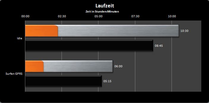 Bei der HDD schwankte die Anzeige im Idle und bei Surfen mit Opera und aktivem 3G-Modul im GPRS Modus zwischen 8:30h und 9:00 respektive 5:00h und 5:30h, bei der SSD waren es konstant 10:30h beziehungsweise, der Werte schwankte zwischen 5:15h und 6:00h. Die Balken im Diagramm zeigen den Durchschnitt dieser Messungen an.
