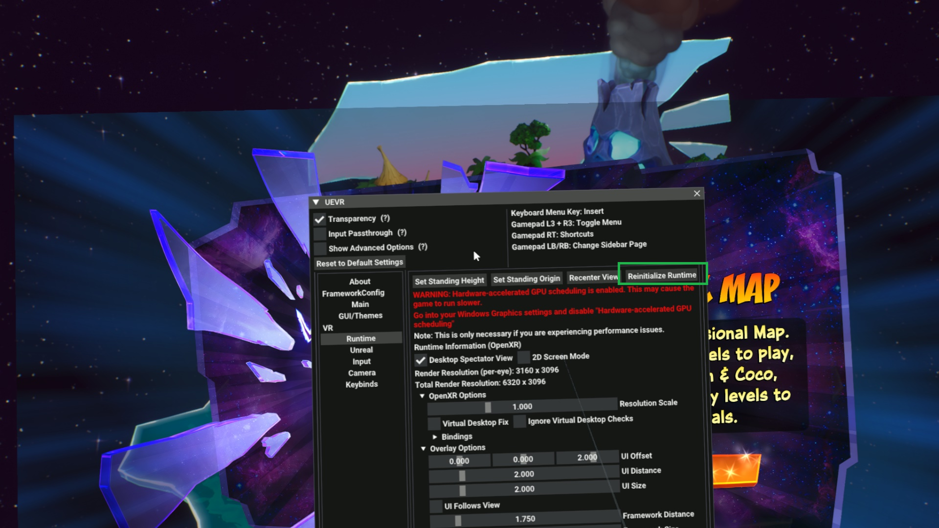 Bei Crash Bandicoot 4 hatte ich zunächst nur das SteamVR-Overlay im Headset, nicht die Bildausgabe des Spiels. Per Mausklick auf "Reinitialize Runtime" hat daas dann aber geklappt. Übber daas "Camera"-Tab habe ich mir die Beutelratte dann auch etwas näher an mich rangeholt: