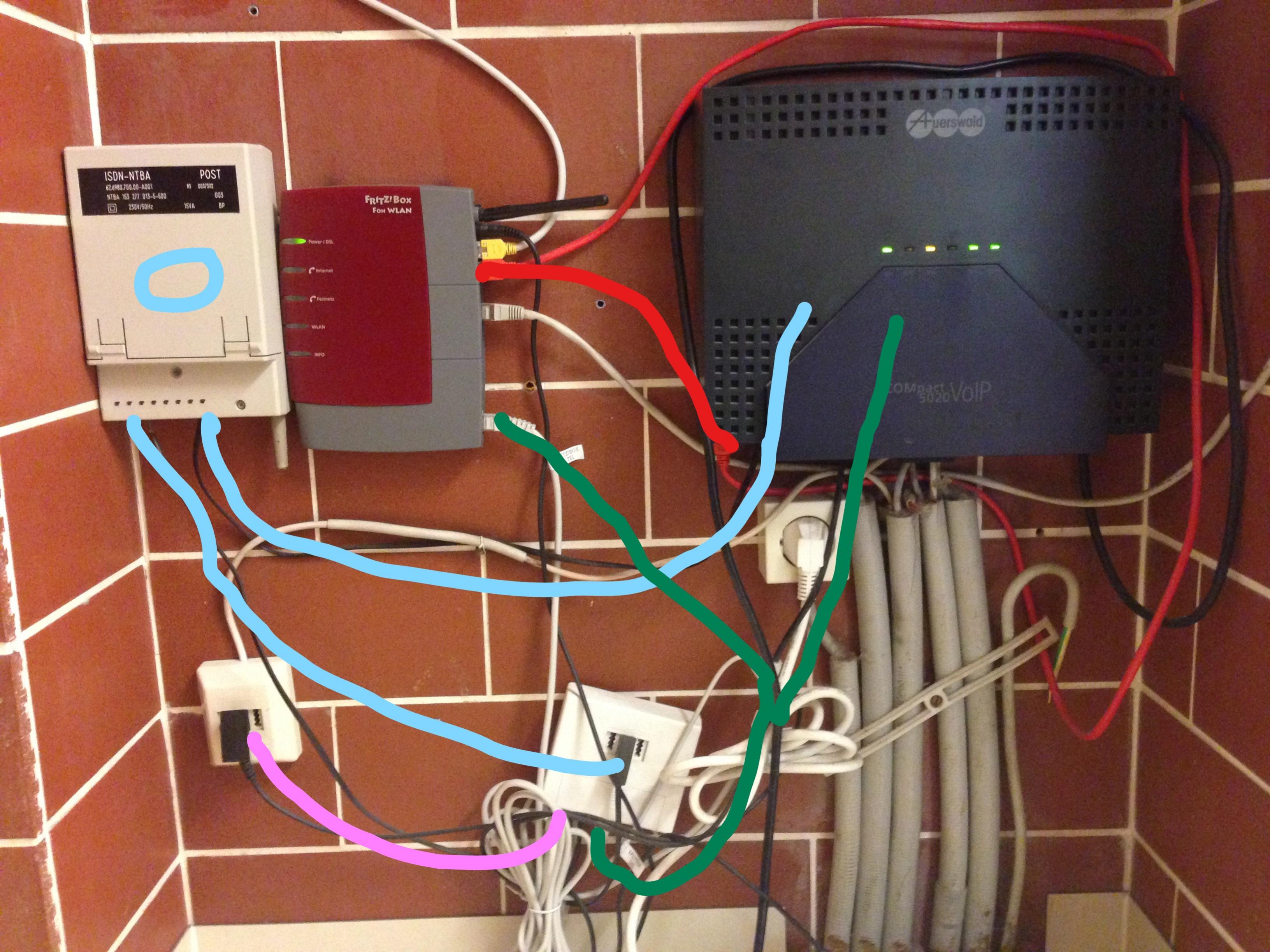 Neben ISDN-BOX: Fritzbox 7170 (die 2 nicht nachgezeichneten Kabel sind unwichtig, 1x dead end, 1x router (daher WLAN Leistung des neuen Modems komplett unwichtig)