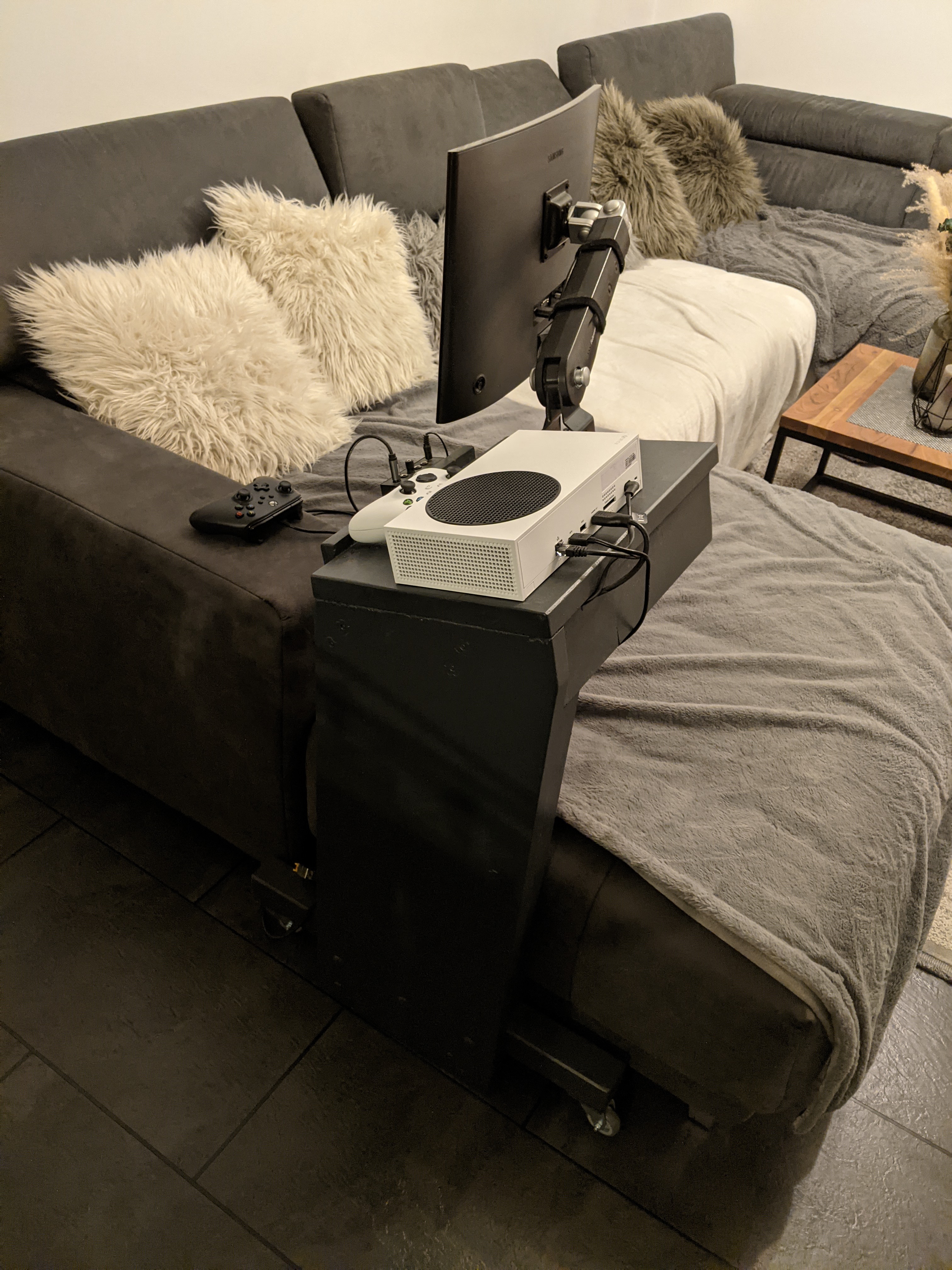 Ich habe mir ein Gestell gezimmert, womit ich gemütlich auf dem Sofa sitzen kann und ein Curved 24" 1080P hängt direkt vor mir. Da das Teil im Wohnzimmer steht, spielt der WAF eine große Rolle. Die PS4 Pro wurde geduldet (auch die Lautstärke ;-) )