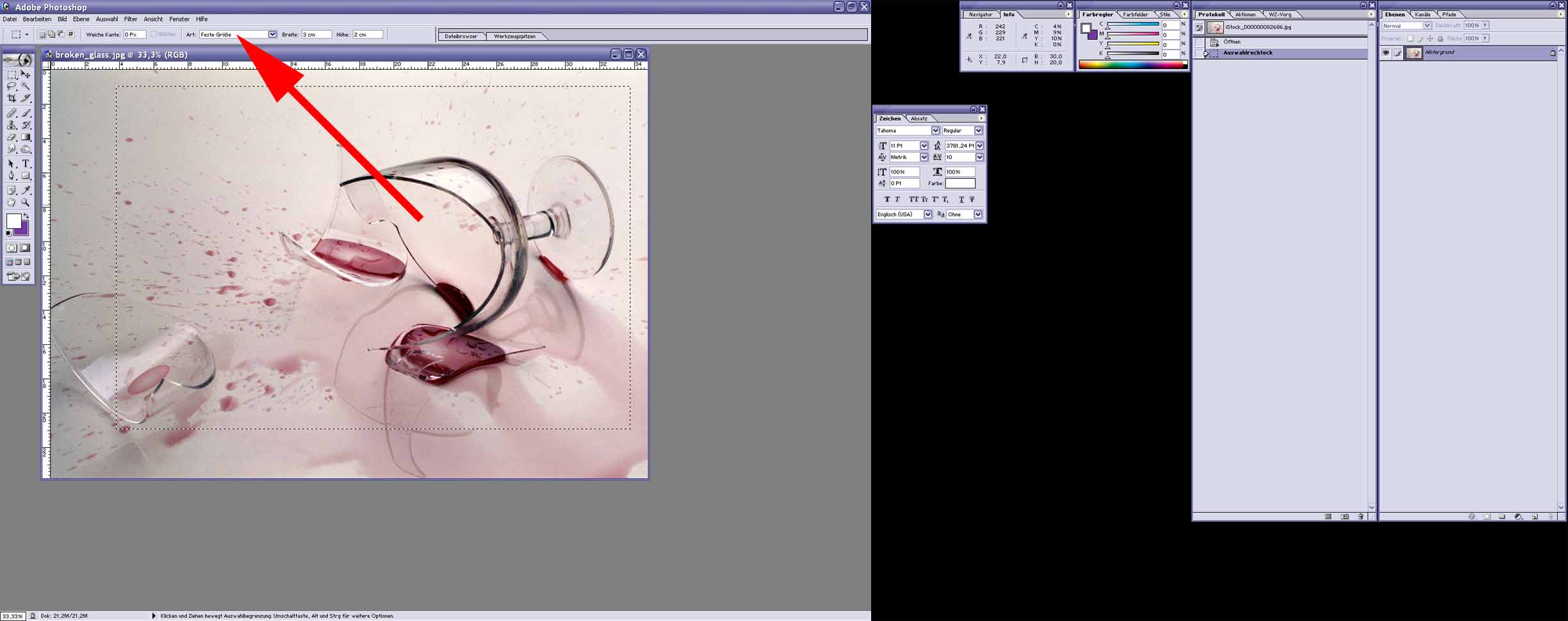 Danach kannst du Photoshop sagen, das du eine "Feste Größe" bei der Auswahl haben möchtest. Dann brauchst du nur noch in das Bild einmal reinklicken und schon hast du deine Auswahl, welche du beliebig innerhalb des Bildes verschieben kannst.