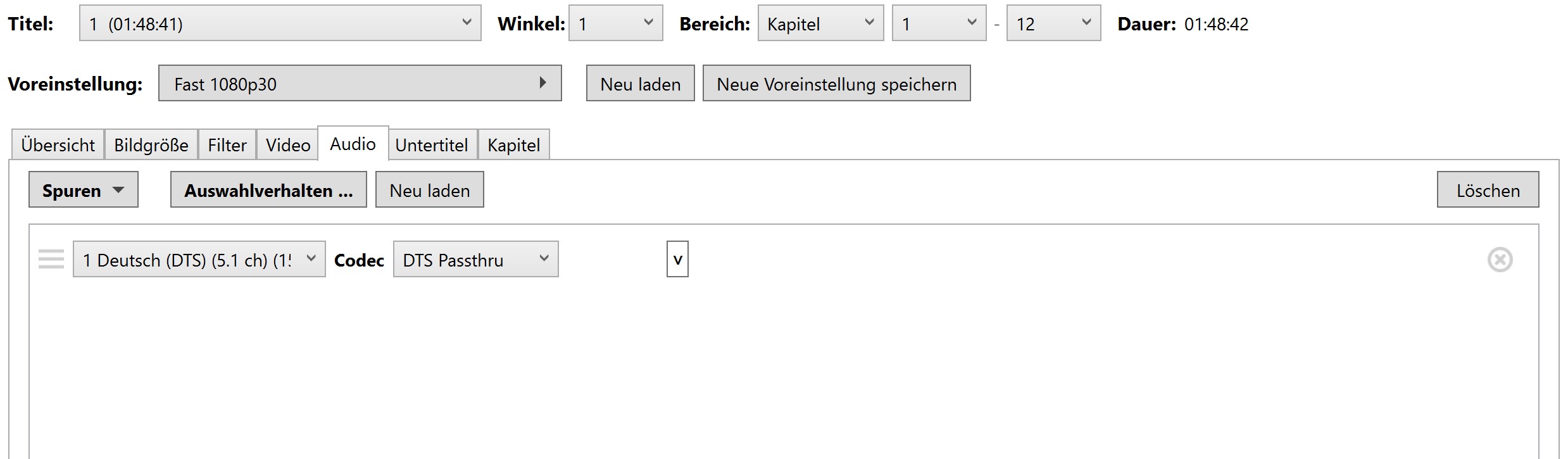- alle vorhandenen Audiospuren zu AC3 448 5.1