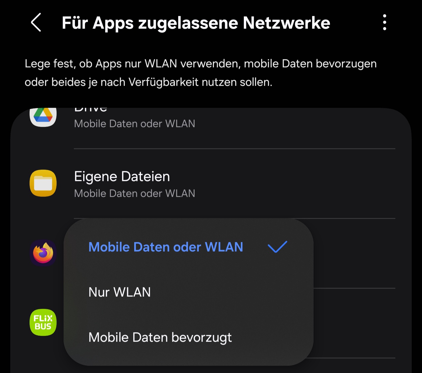 Hier konnte man einfach in den Android-Einstellungen bzw. durch Gedrückthalten des Appsymbols über deren Einzelberechtigungen wählen, ob die App per WLAN, per Mobilfunlmk, über beide Wege oder eben gar nicht mit dem Internet kommunizieren darf.